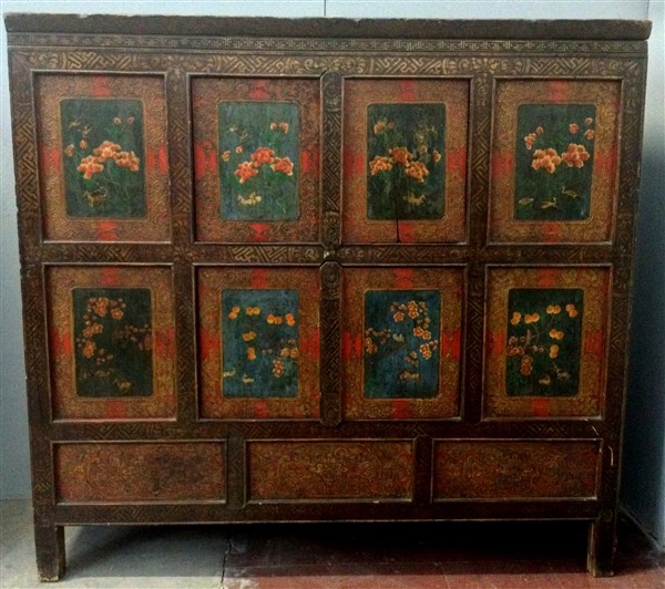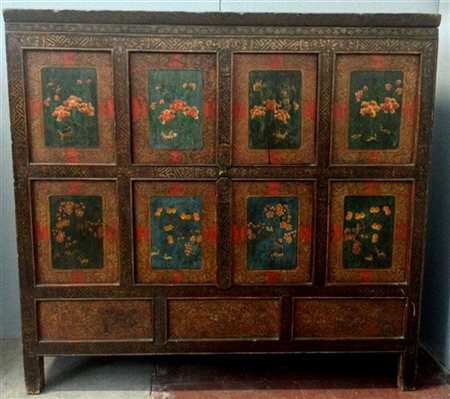 Antico mobile Tibetano, legno verniciato con decorazioni floreali, ante pannellate (difetti)