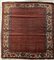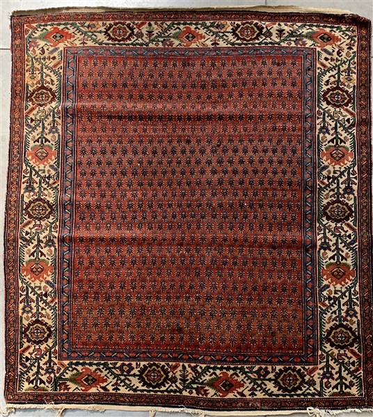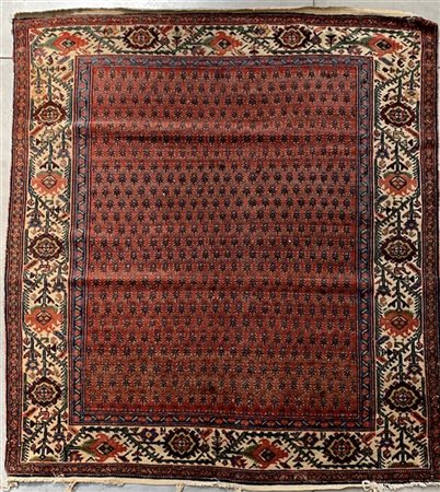 Tappeto Serabend Mir, Persia, secolo XX. Decoro con file di Boteh su fondo rosso. Bordura a meandro con fiori su fondo bianco (cm 164x144) (difetti)