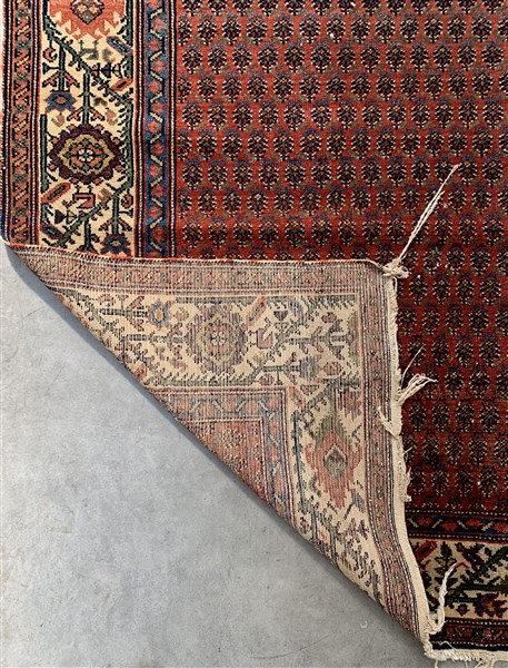 Tappeto Serabend Mir, Persia, secolo XX. Decoro con file di Boteh su fondo ross