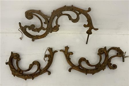 Gruppo di tre appliques in metallo sbalzato a volute fogliacee, misure diverse. Secolo XIX