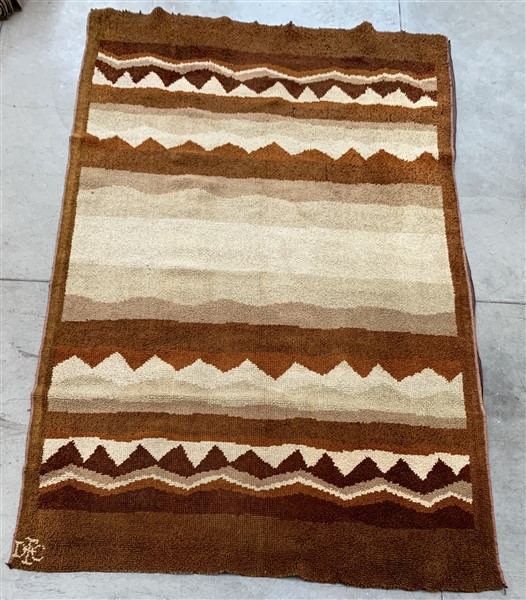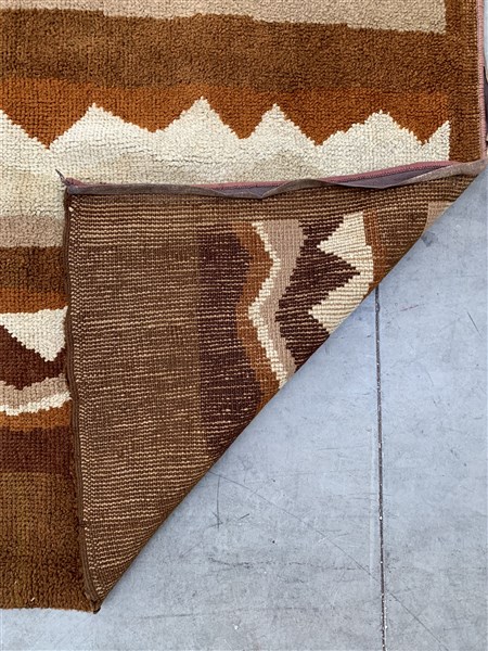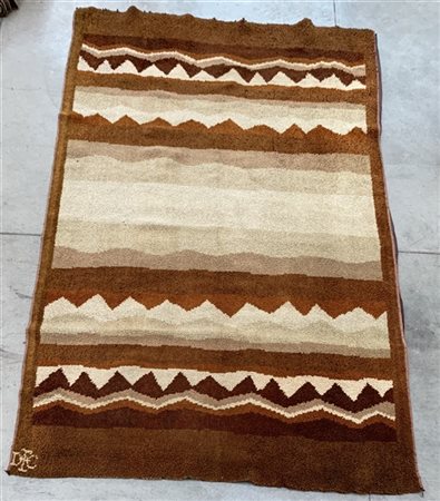Tappeto con decoro stilizzato nei toni del beige, crema, nocciola, camoscio, marrone. Annodato in lana in Europa negli anni '40. Siglato in basso a sinistra DFC. (cm 285x190) (difetti e macchie)