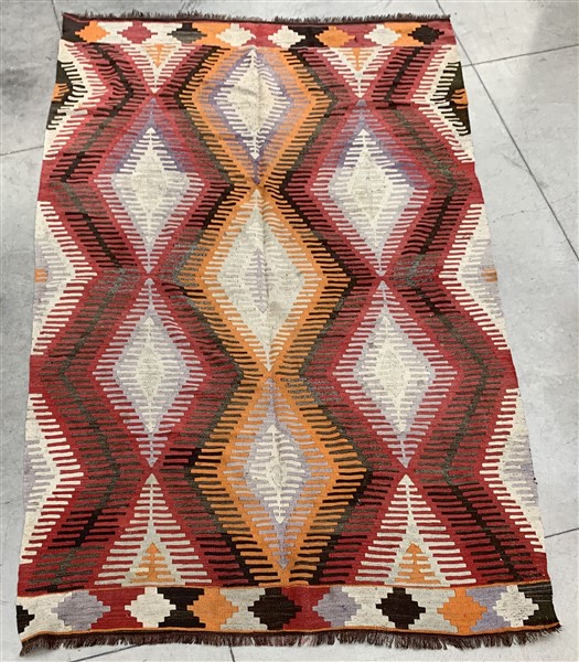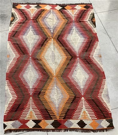 Tappeto Kilim, Anatolia, secolo XX. Decoro romboidale a lisca di pesce (cm 288x170) (difetti, rapature, macchie e buchini)