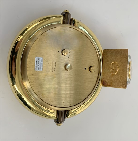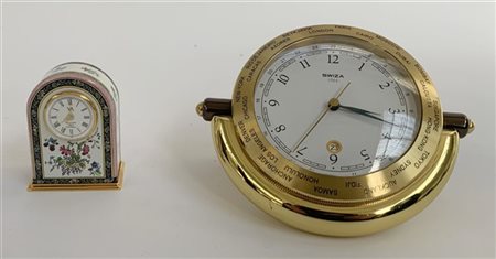 Lotto composto da un orologio da tavolo Swiza 1904 con fusi orari, struttura in metallo dorato, movimento al quarzo e un piccolo orologio da tavolo in metallo smaltato di produzione recente (h. max cm 6,5) (difetti)