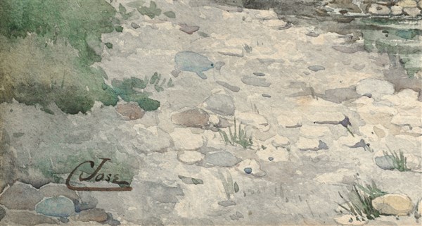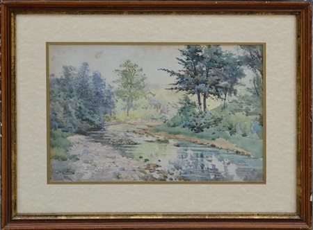 Firma indecifrata "Paesaggio fluviale" acquerello su carta (cm 26x38) Firmato in basso a sinistra. In cornice