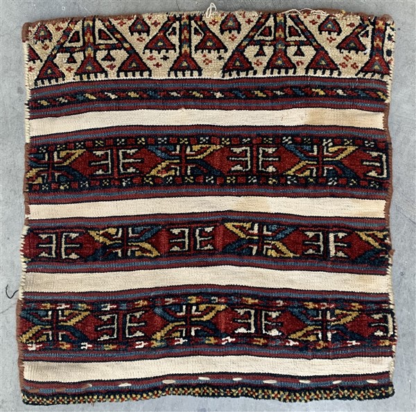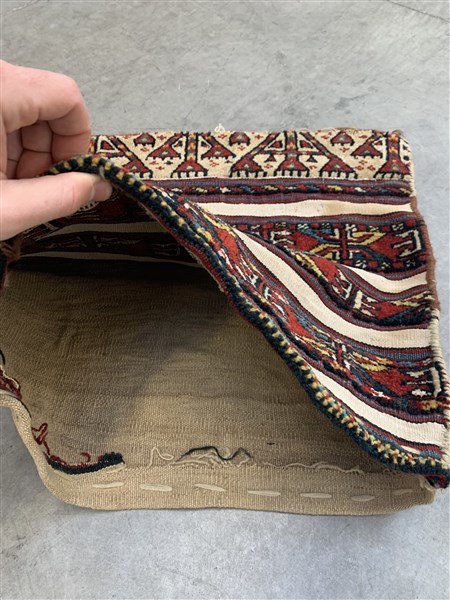 * Tappeto Konia, Anatolia, secolo XX. Interessante esemplare di tappeto utilizzato come sacca da trasporto dei nomadi (cm 53x49) (difetti e macchie)