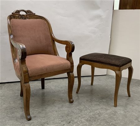 Lotto composto da una poltrona del secolo XIX in noce intagliato con braccioli a ricciolo, seduta e spalliera rivestite in velluto rosa, ed un panchetto con gambe mosse (difetti e restauri)