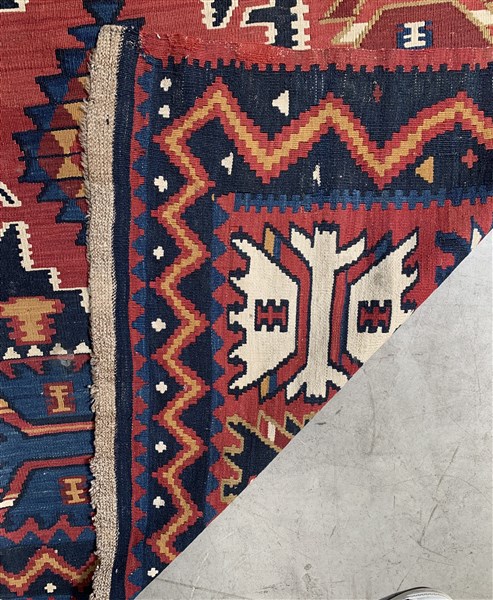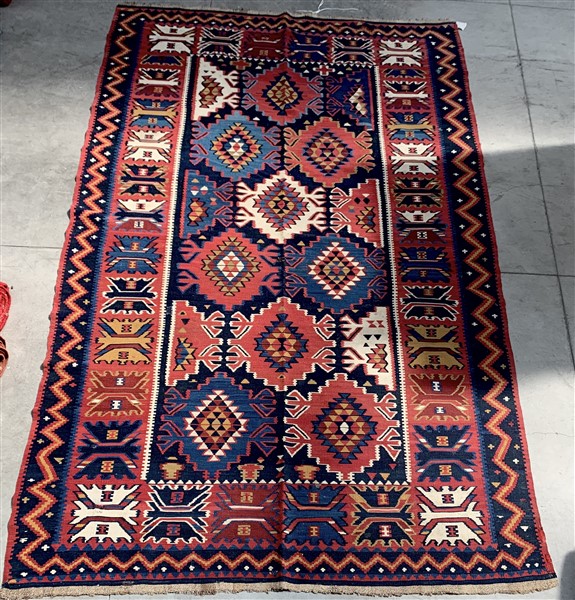 Tappeto Kilim, Caucaso, inizio secolo XX. Decoro con medaglioni policromi su fo