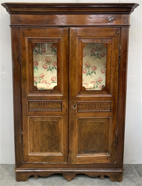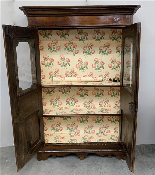 Vetrinetta a due ante riquadrate nella parte inferiore, fascia sagomata e piedi a mensola (cm 108x150x32) (difetti)
