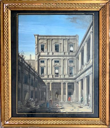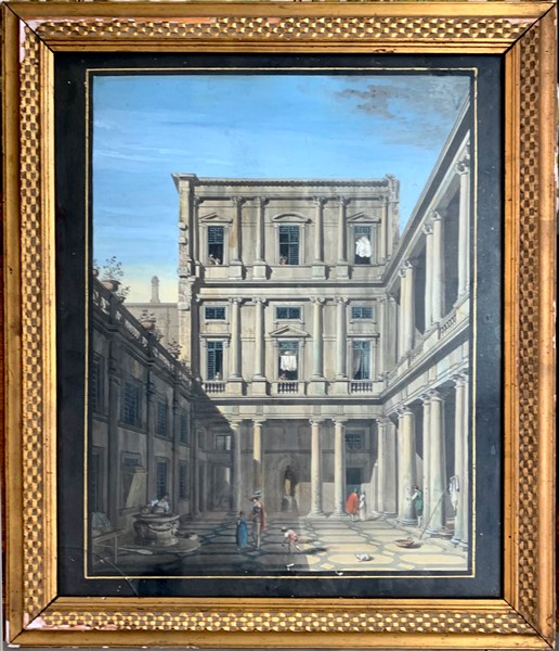 Artista del XIX Secolo. Gouache raffigurante "Cortile" (cm 46x35) In cornice