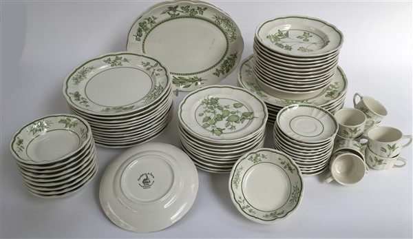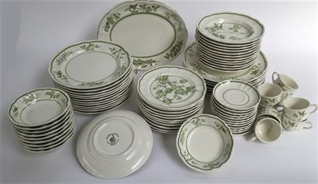 Manifattura di Laveno, Richard Ginori. Parte di servizio di piatti in ceramica a decori naturalistici verdi, composto da dodici piatti piani e dodici fondi, sette sottopiatti, dodici piattini da frutta e dieci coppette, due piatti da portata ovali e otto tazzine con dodici piattini (difetti)