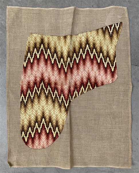 Frammento di ricamo in seta Point d'Hungrie, secolo XIX. Decoro "fiammato". Applicato su tela di iuta (cm 64x50) (lievi difetti)
