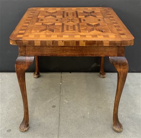 Tavolino con piano intarsiato e gambe mosse (cm 53x47x53) (lievi difetti)