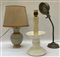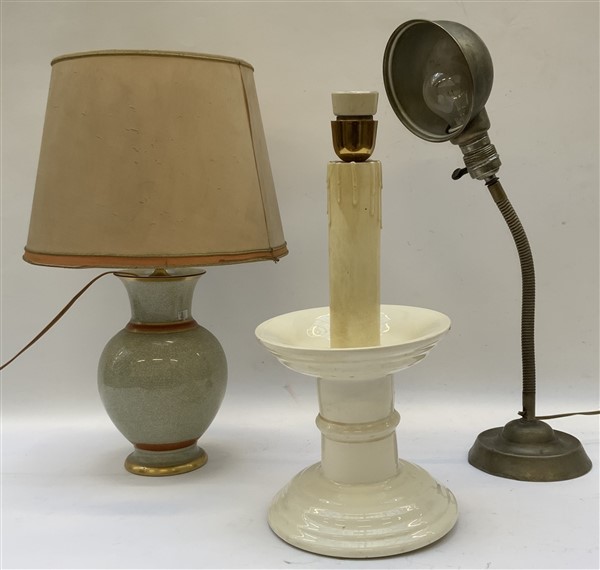 Lotto composto da due lampade da tavolo a una luce in ceramica policroma ed una lampada per pianoforte in metallo con braccio snodabile (difetti e mancanze)