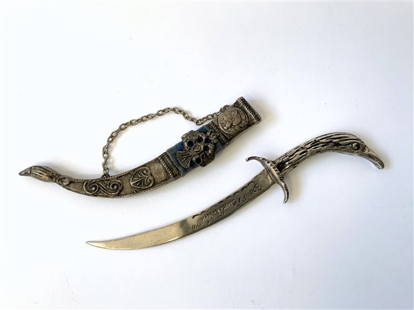 Tagliacarte a foggia di antica daga in metallo argentato, lama ricurva e incisioni in greco. Prodotta in Grecia, seconda metà del secolo XX (l. cm 27)