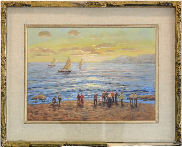 Giovanni Morello (XX Secolo) "Marina con pescatori" olio su compensato (cm 30x4