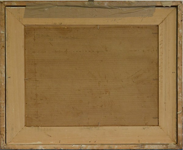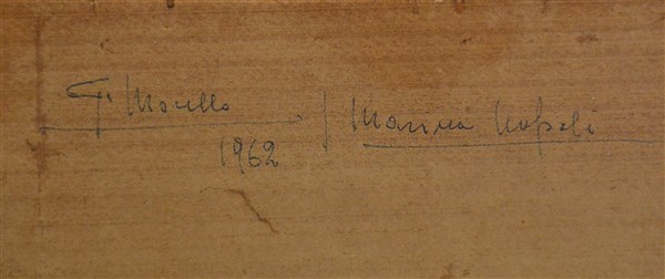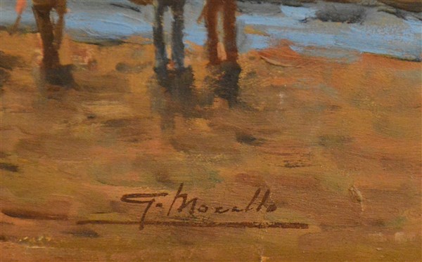 Giovanni Morello (XX Secolo) "Marina con pescatori" olio su compensato (cm 30x40) Firmato in basso a destra. Al retro: firmato e titolato. In cornice (difetti e mancanze alla cornice)