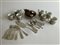 Lotto composto da sette tazzine in porcellana con cestelli in argento traforato, dieci cucchiaini, una paletta e undici forchettine in argento di fatture differenti, e una saliera a forma di pulcino e gusci d'uovo in argento su base in legno (g 1050 lordi) (lievi difetti)