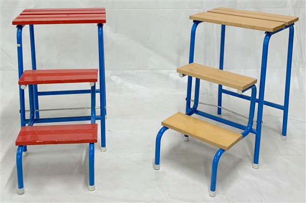 Coppia di piccole scale-sgabelli pieghevoli in metallo e legno (h cm 60) (difet