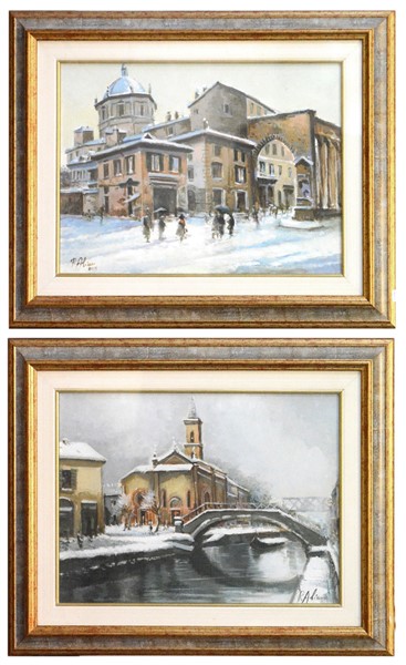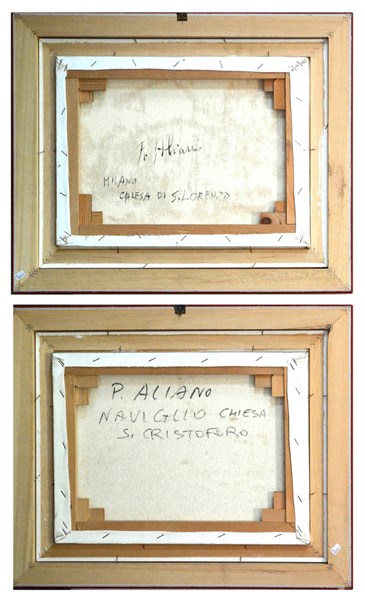 Firma indecifrata "Naviglio, Chiesa di S.Cristoforo" e "Milano , Chiesa di S.Lorenzo" due dipinti ad olio firmati. Al retro: firmati e titolati, in cornice
