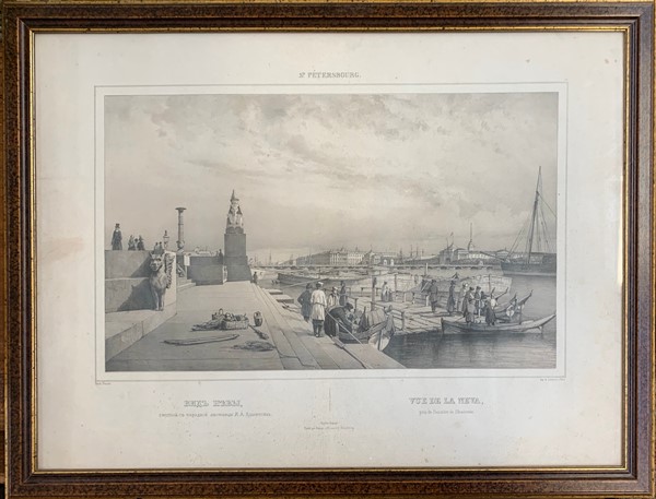 Lotto di due incisioni raffiguranti uno scorcio di San Pietroburgo e la piazza con la Chiesa di Sant'Isacco, in cornici (difetti)