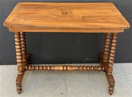 Tavolino da salotto con montanti e gambe tornite, secolo XIX (cm 88x70x43) (difetti)