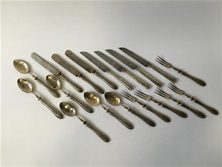 Parte di servizio composto da tre coltelli, sei cucchiai e cinque forchettine in metallo dorato con impagnature decorate a motivi fioriti unito a quattro coltelli da arrosto in metallo argentato (difetti)