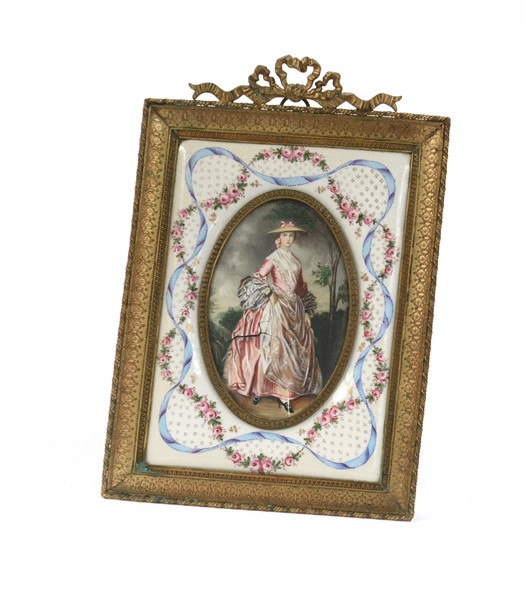 Cornice in bronzo e porcellana dipinta contenente un ritratto femminile (cm 27x