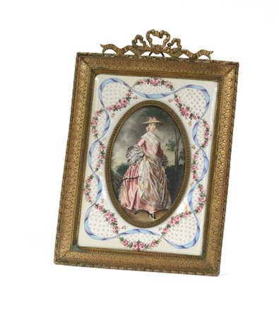 Cornice in bronzo e porcellana dipinta contenente un ritratto femminile (cm 27x19) (difetti)