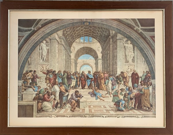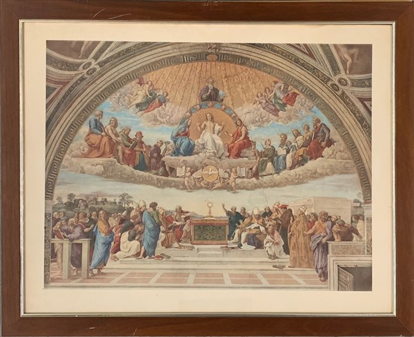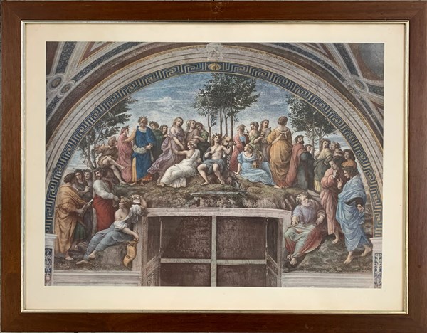 Gruppo di tre riproduzioni a colori raffiguranti affreschi delle "Stanze di Raffaello" (cm 52x68), in cornici