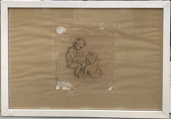 Ignoto del secolo XIX "Due putti" penna e inchiostro bruno su tracce a matita nera su carta (cm 18,5x16,5 circa). In cornice