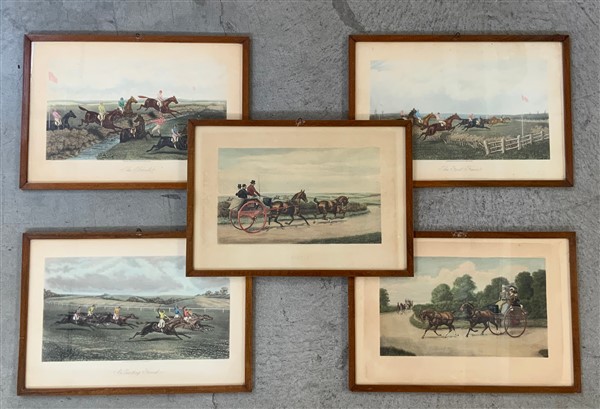 Gruppo di cinque stampe inglesi a colori raffiguranti gare ippiche (fogli cm 30x44), in cornici (difetti)