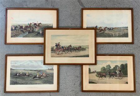 Gruppo di cinque stampe inglesi a colori raffiguranti gare ippiche (fogli cm 30