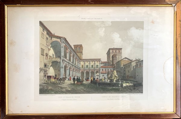 Gruppo di sette stampe a colori raffiguranti monumenti e scorci urbani (cm 37x55), in cornici (difetti)