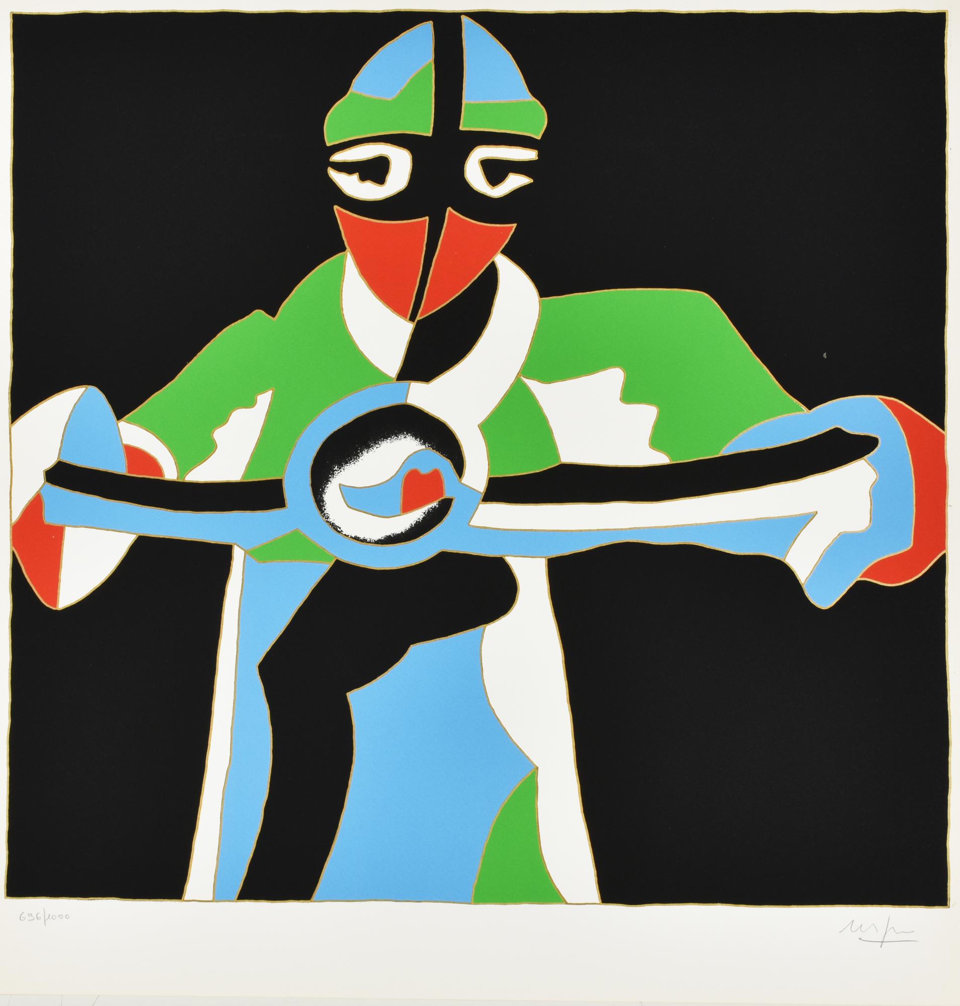 Ugo Nespolo IL MOTOCICLISTA serigrafia su carta, cm 54x50; es. 696/1000 firma