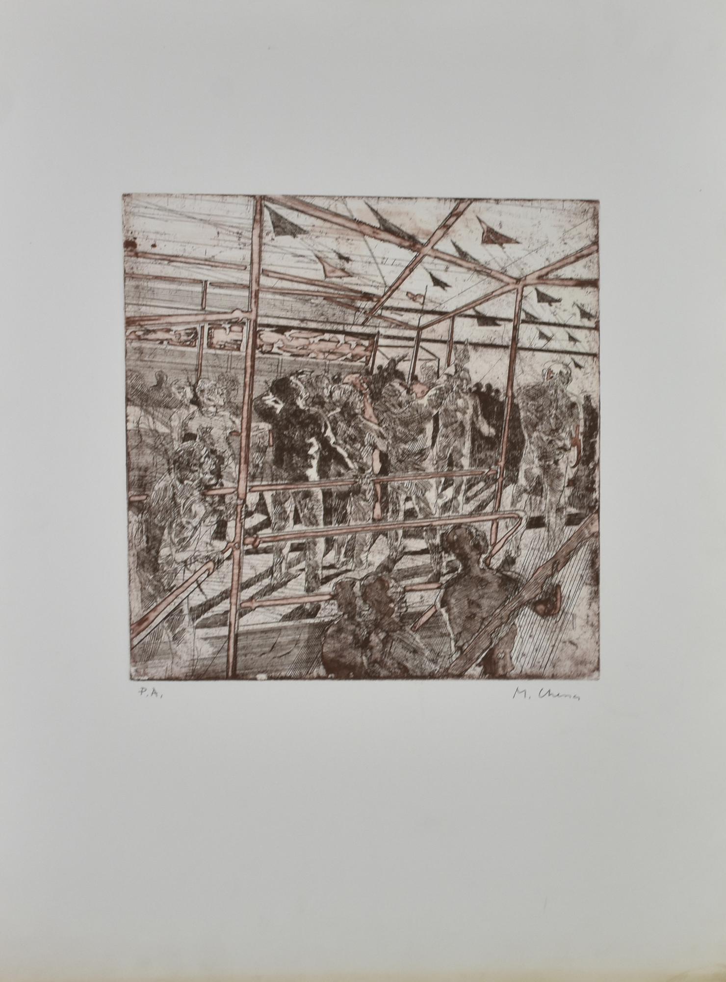 Mauro Chessa ATTACCO AEREO incisione su carta, battuta cm 32,5x30, su foglio...