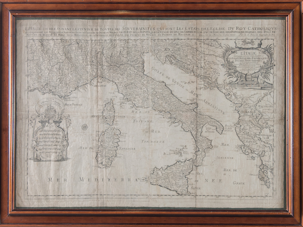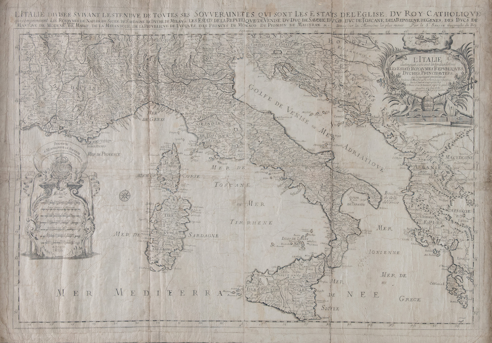 H. IALLOT, "L'Italie divisée suivant l'estendue de toute ses souverainetes qui sont les estas de l'Eglise, du Roy Catholique", 1672. Cartina geografica dell'Italia. Cm 63x90,5.