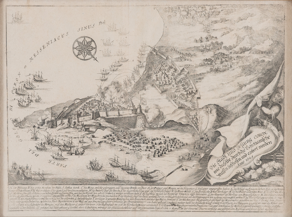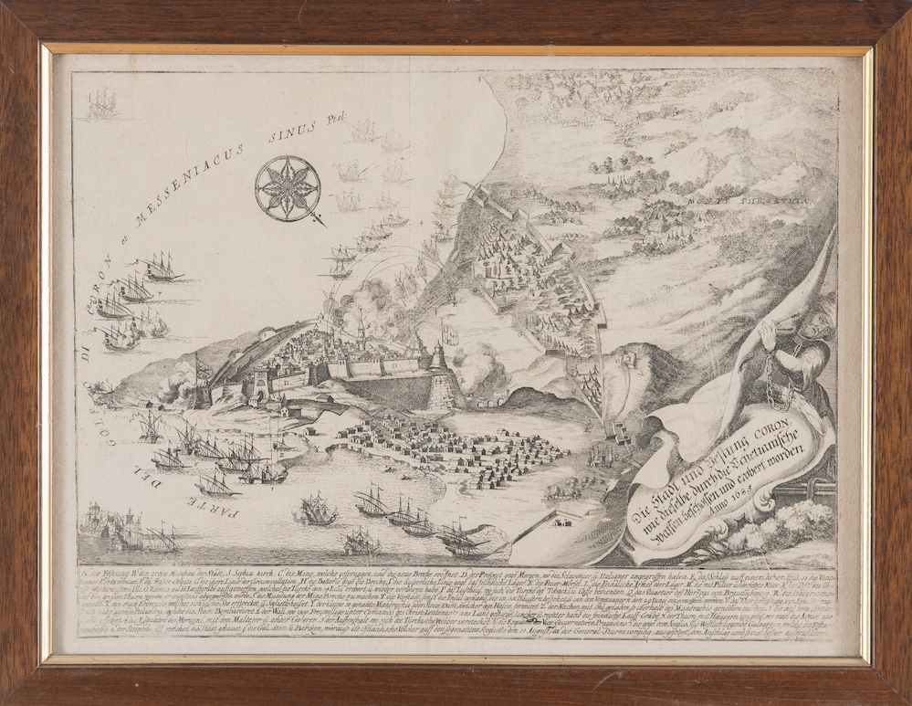 Lotto composto da due illustrazioni militari. Stampa calcografica. Illustrazione 1: Accampamenti militari, cm 26x35. Illustrazione 2: Assedio di Coron, cm 31,5x42.