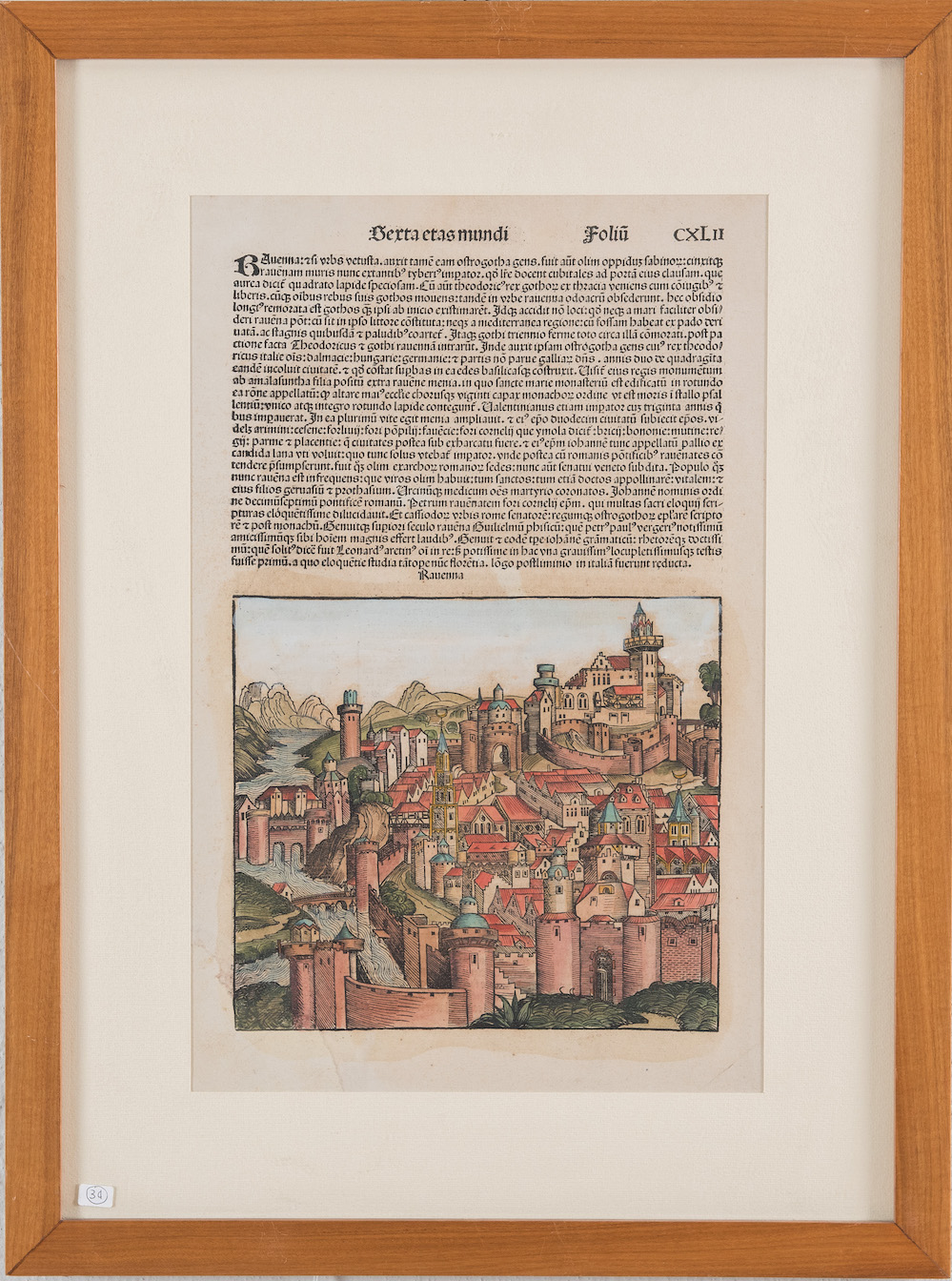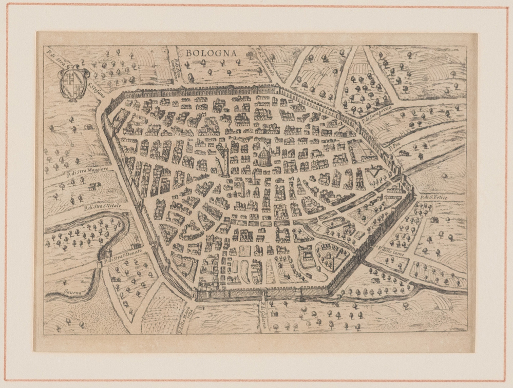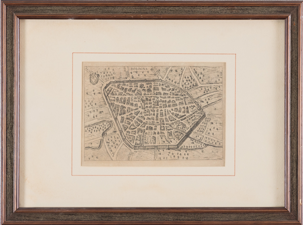 Lotto composto da tre stampe. Stampa calcografica di cui una con interventi ad acquerello originali. Stampa 1: Berta etas mundi, cm 41,5x26,5. Stampa 2: Chietti Città Reggia, cm 30,5x19,5. Stampa 3: Mappa di Bologna, cm 14x18,5.