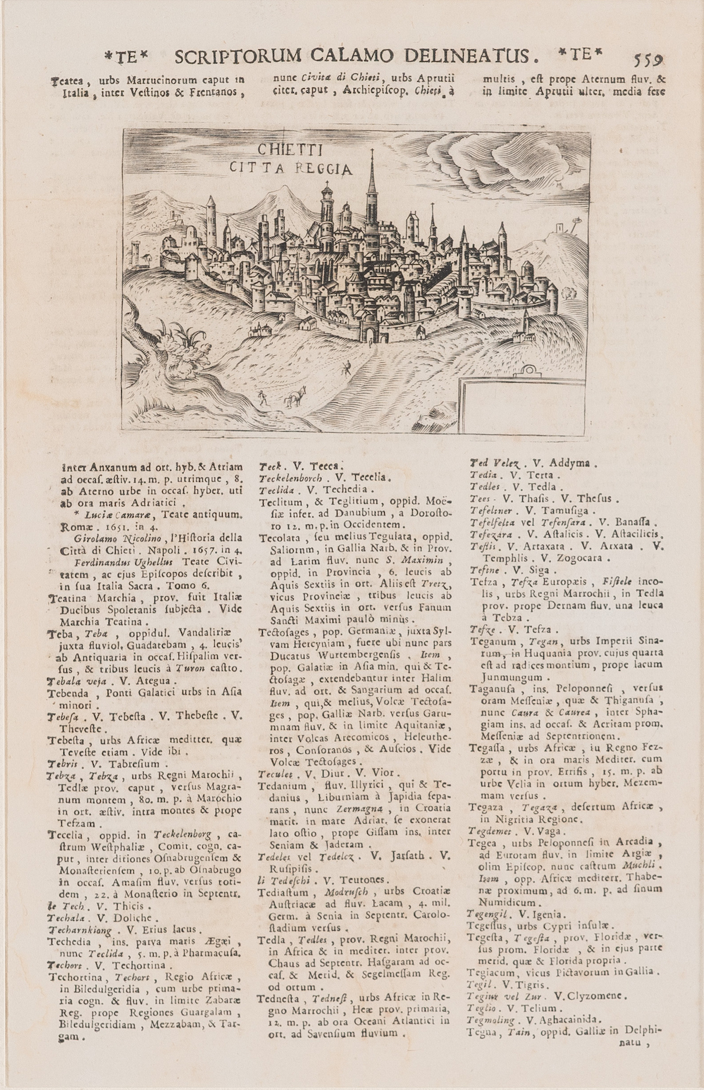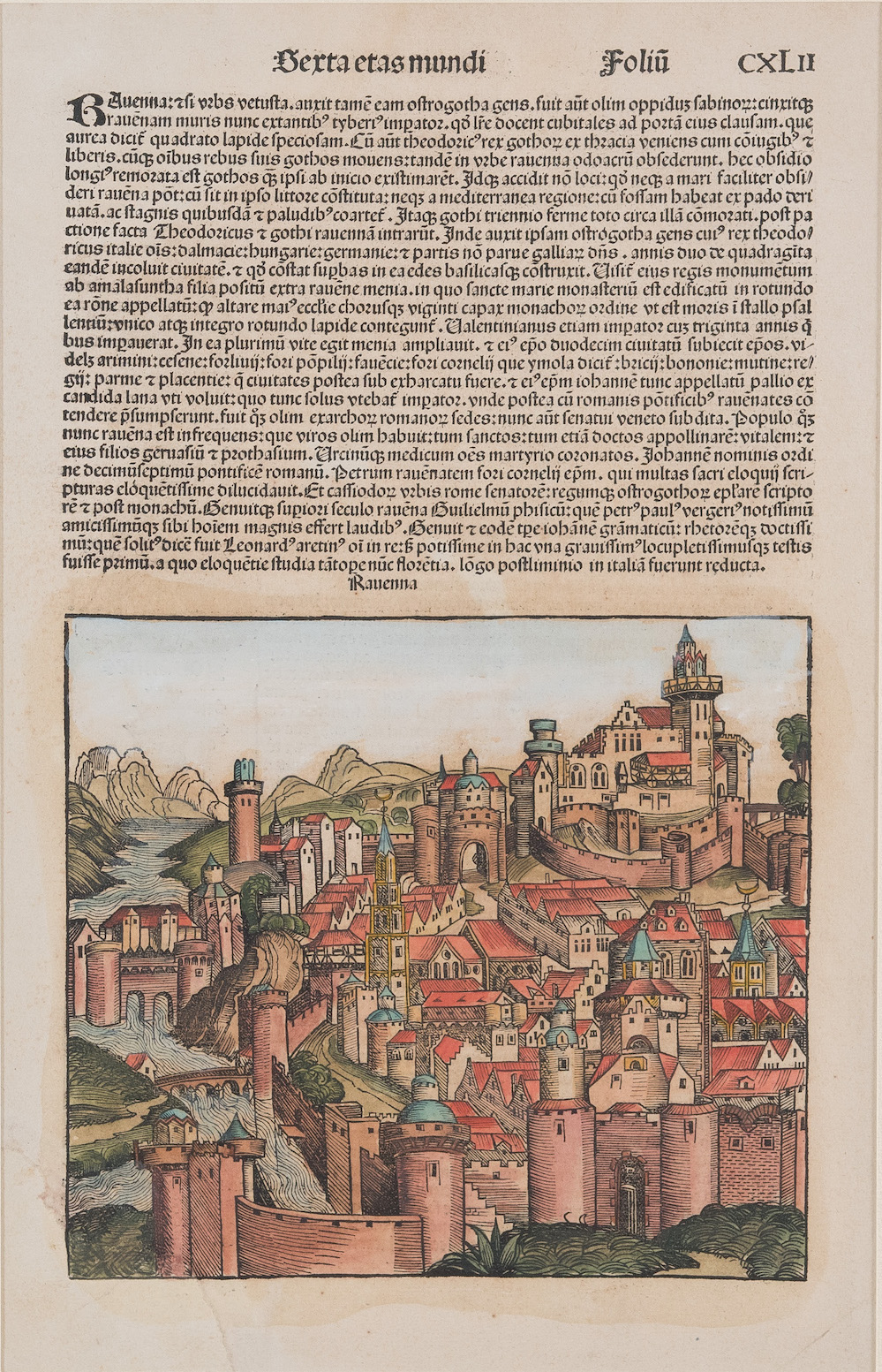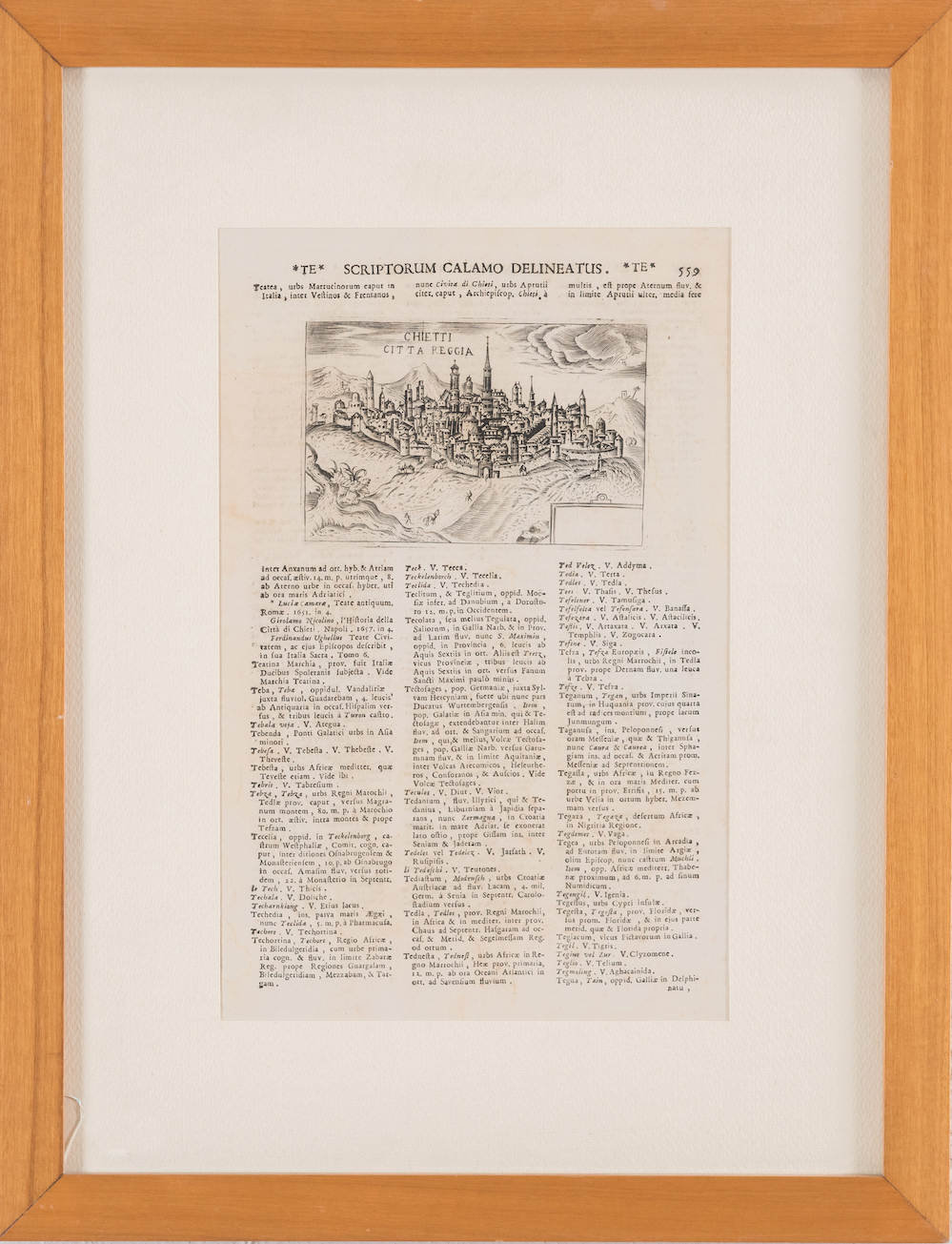 Lotto composto da tre stampe. Stampa calcografica di cui una con interventi ad acquerello originali. Stampa 1: Berta etas mundi, cm 41,5x26,5. Stampa 2: Chietti Città Reggia, cm 30,5x19,5. Stampa 3: Mappa di Bologna, cm 14x18,5.