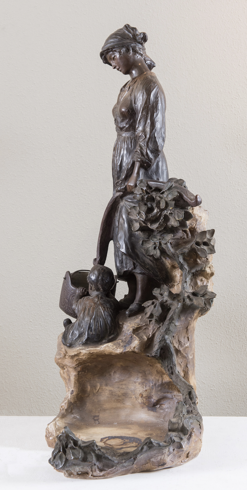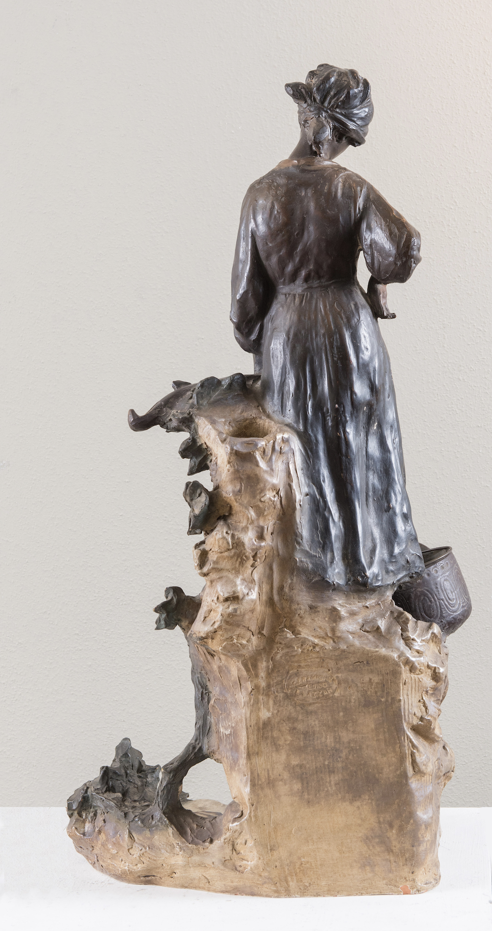 "La lavandaia". Scultura in terracotta ad imitazione del bronzo. Fine XIX secolo - inizi XX secolo. Reca al retro scritta Ceramiche Treviso Lazzar. Cm 70x35x32. (Difetti)