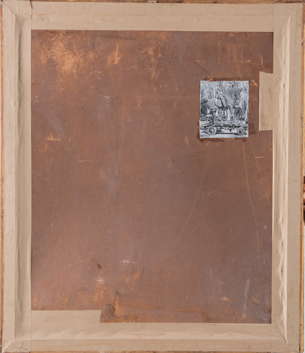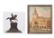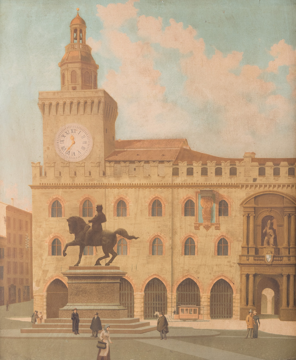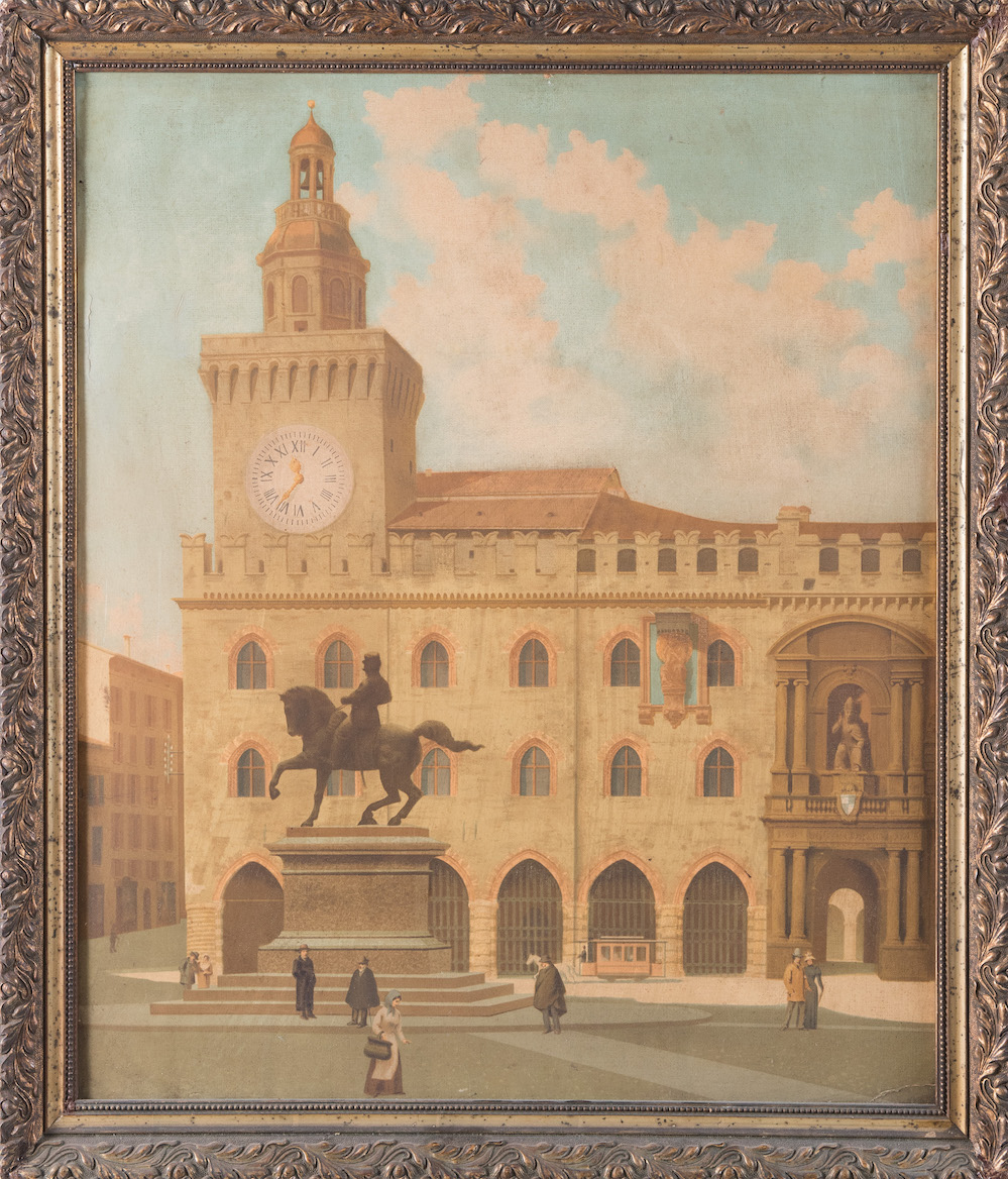 "Vittorio Emanuele II". Scultura in bronzo. Modellino per il monumento dei Giardini Margherita, prima in Piazza Maggiore. Cm 24,5x20x15,5. Scultura accompagnata da oleografia, raffigurante il monumento di Vittorio Emanuele II in Piazza Maggiore, di cm 67x55.