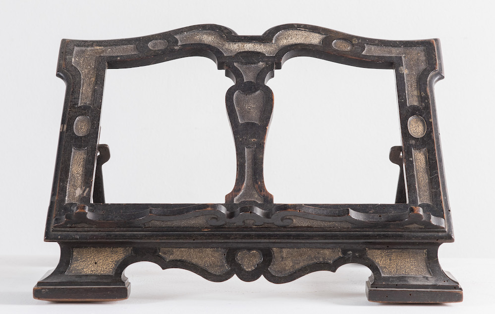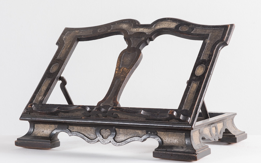 Leggio in legno laccato con riserve a fondo ribassato, con tracce di argentatura. Lombardo-veneto, prima metà del XVIII secolo. Chiuso: cm 12x45x34,5.
