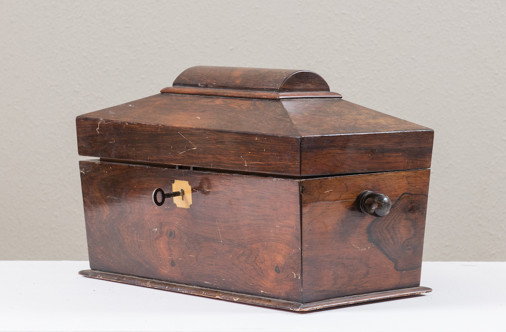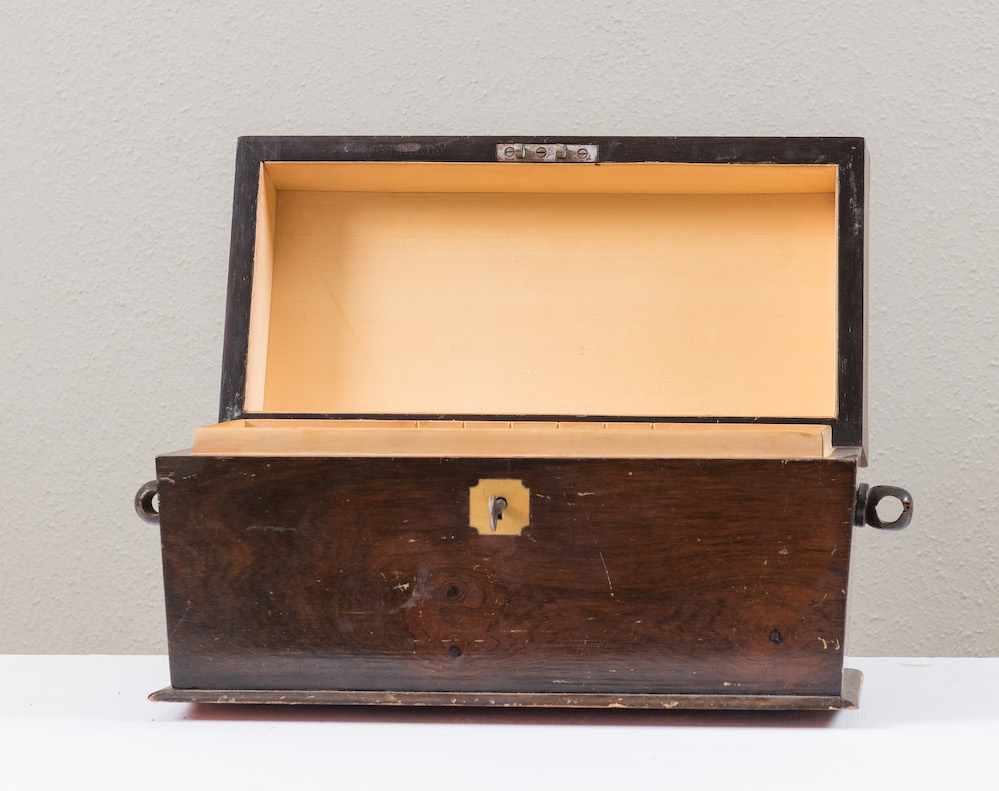 Bauletto. Francia, XIX secolo. Lastronato in palissandro con interni in acero. Cm 21x36,5x17,5.