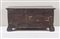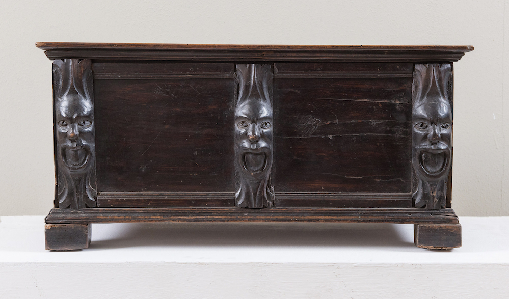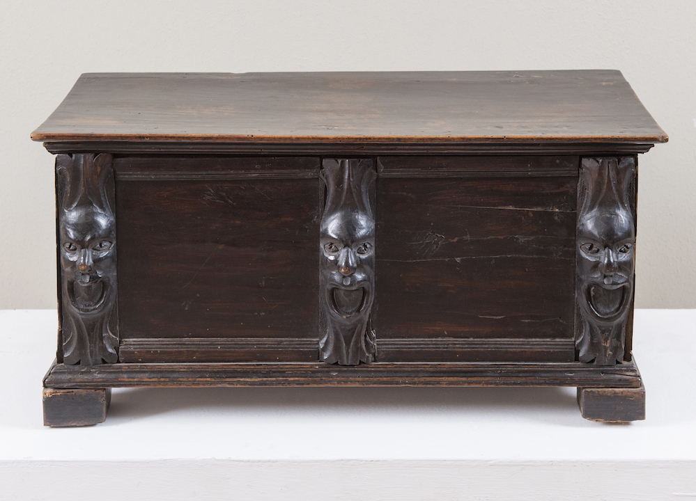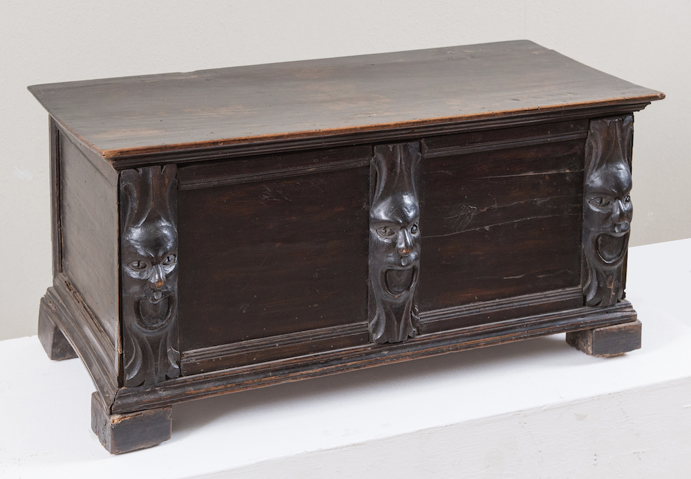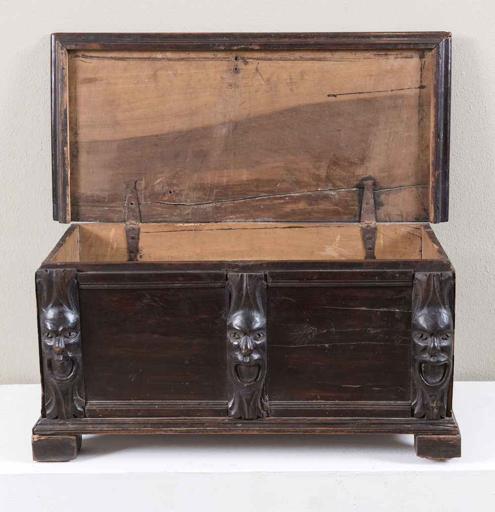 Piccola cassapanca. Lombardia, metà del XVIII secolo. Realizzato in legno di noce. Reca mascheroni intagliati sul fronte. Cm 33x69x33.