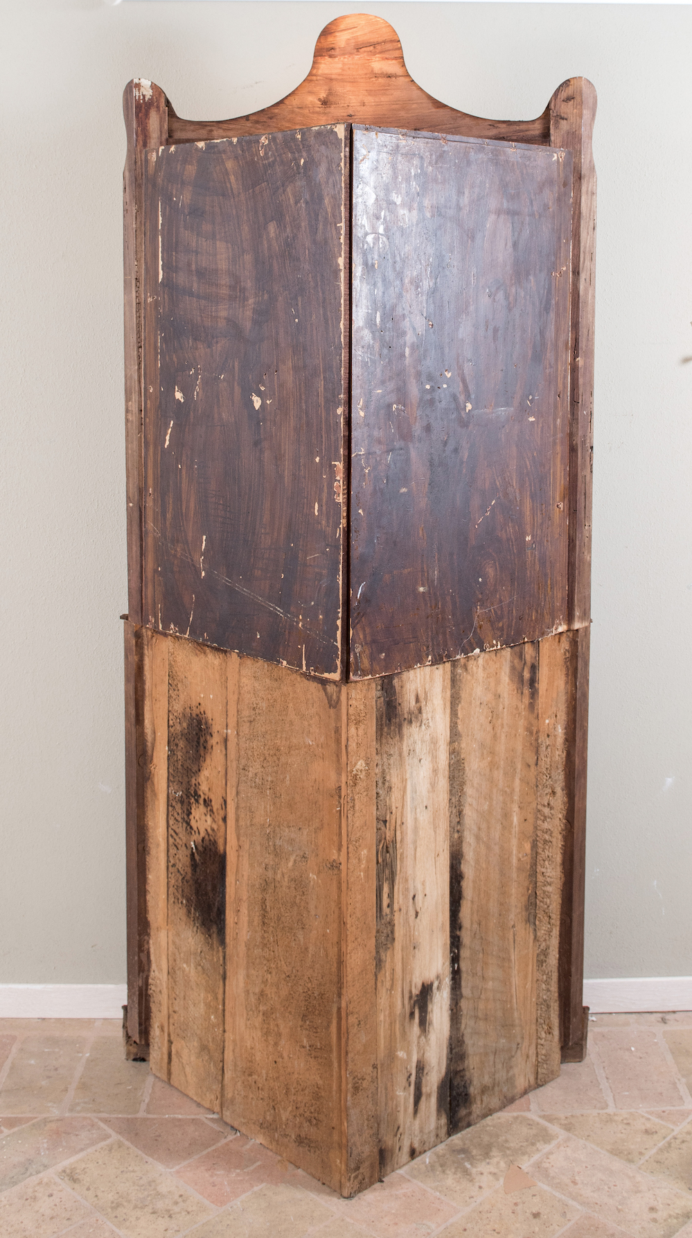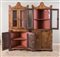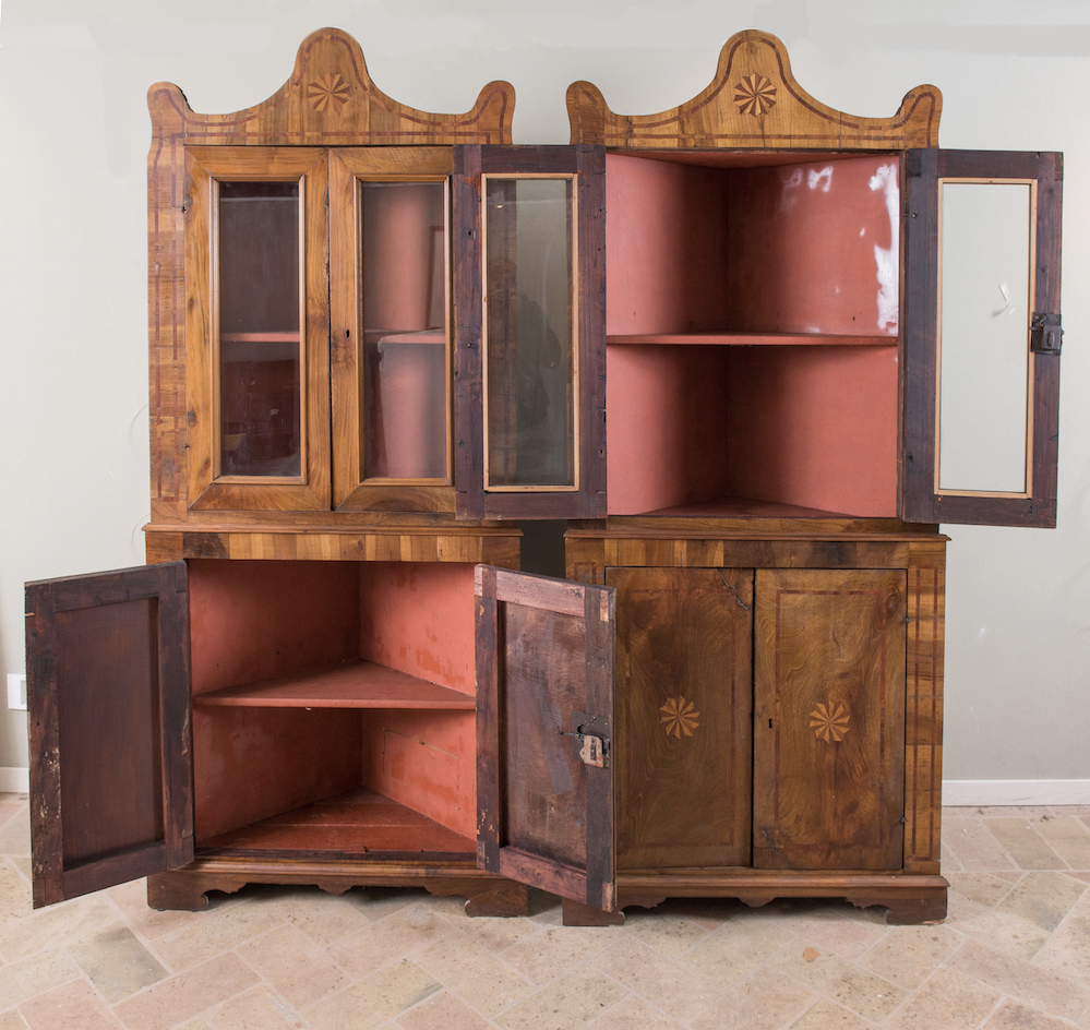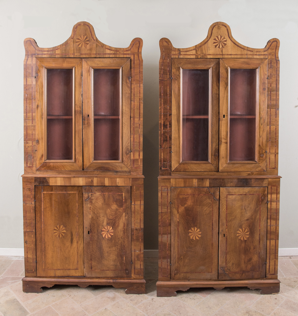Coppia di angoliere. XX secolo. Composte da due elementi e lastronate in noce e filettature in bois de rose e acero. Realizzate su modello di mobili napoletani del XVIII secolo. Cadauna cm 210x63x65.