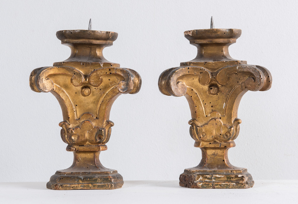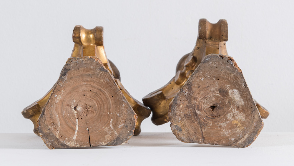 Coppia di portapalme in legno intagliato e dorato. Di gusto Luigi XV. Metà del XVIII secolo. H. cm 26.