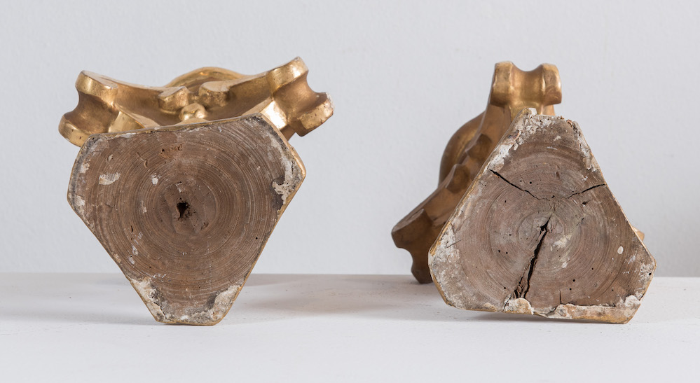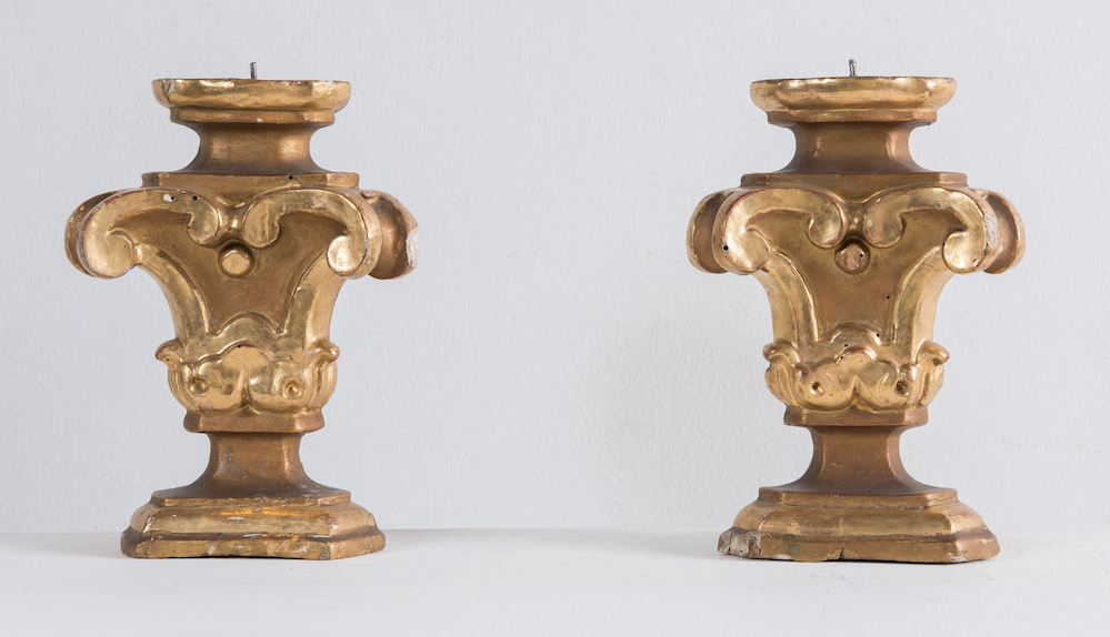 Coppia di portapalme in legno intagliato e dorato. Di gusto Luigi XV. Metà del XVIII secolo. H. cm 24.