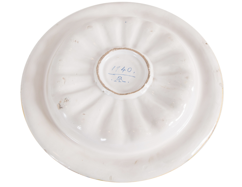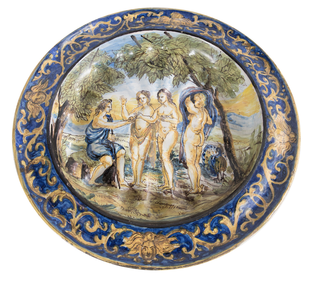 Piatto istoriato policromo. Fine XVIII - inizi XIX secolo. Raffigurante scena del pomo della discordia. Diametro: cm 34. Sotto la base reca scritta AR 1740.