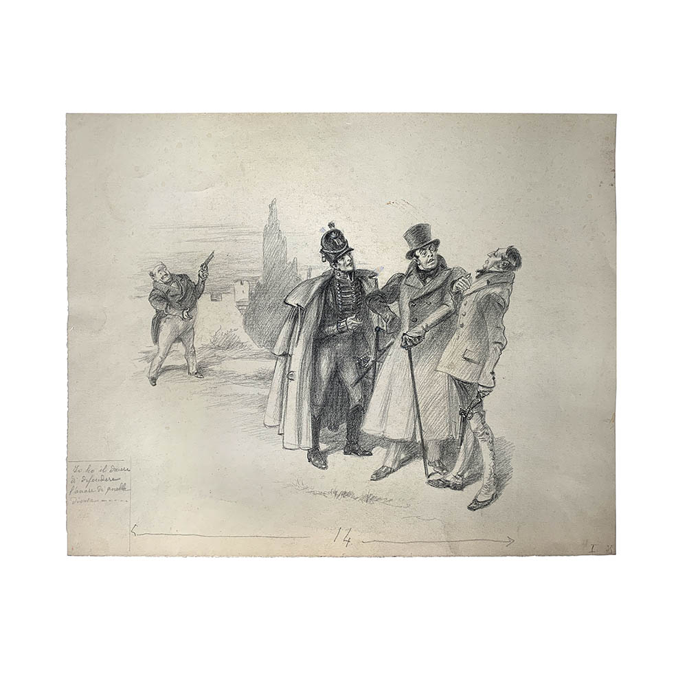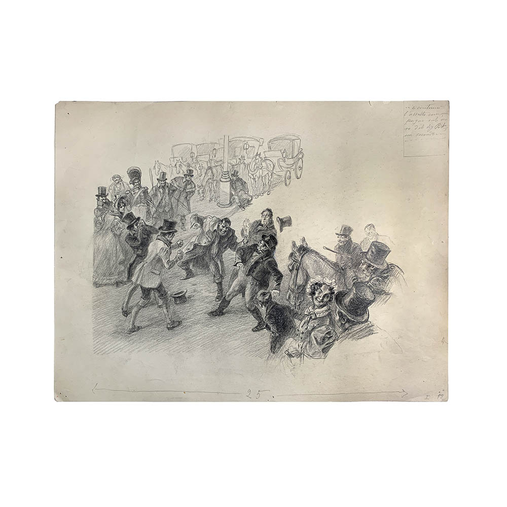 Lotto composto da n. 3 disegni, matita su carta, per “Gli annali postumi del circolo Pickwick, Rizzoli, 1946”, capitolo n. 2. Dimensioni: