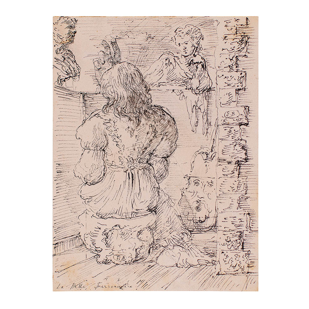 inchiostro su carta, cm 30,5x22,8. Siglato e datato al centro verso destra e in basso verso sinistra: E B 1945. Titolato in basso a sinistra: La Belle Ferroniere.